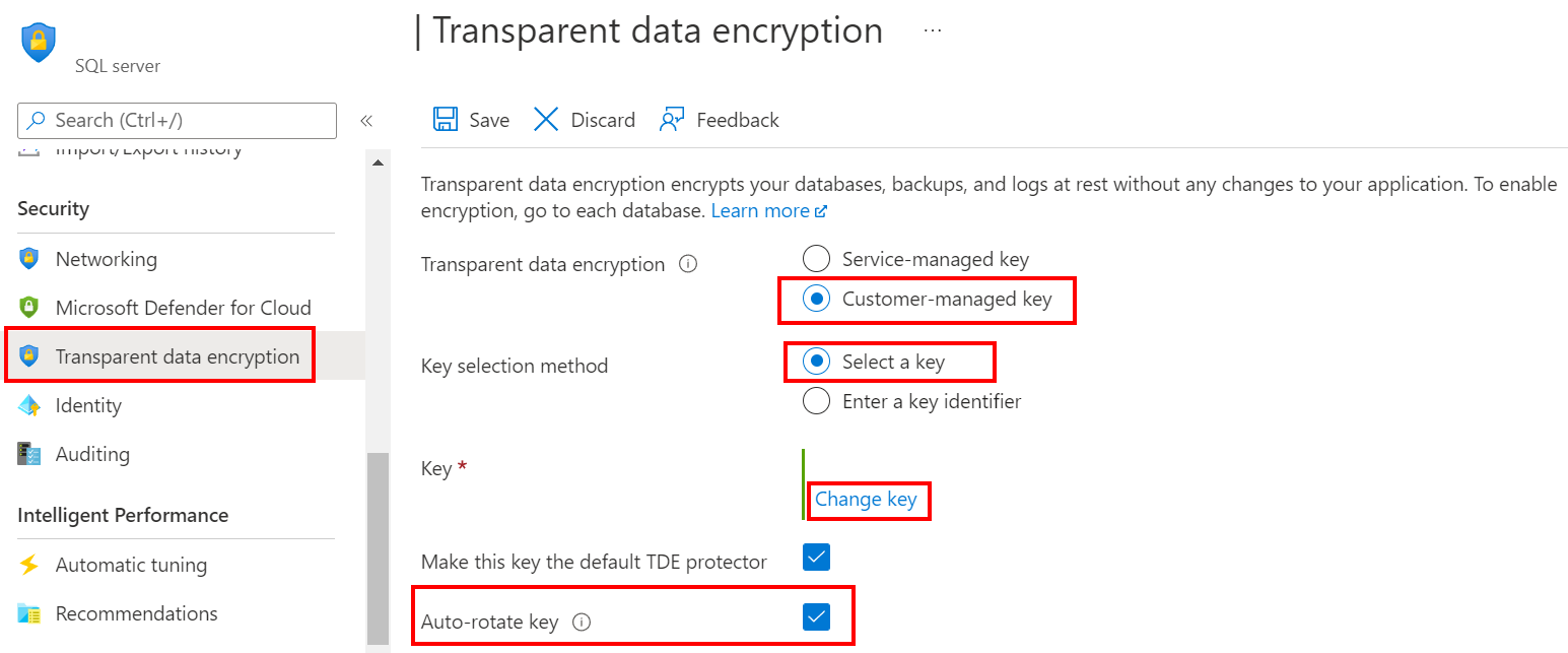 也可以在 Azure SQL 数据库的数据库级别启用自动密钥轮换。 如果只想为服务器上的一个数据库或数据库子集启用自动密钥轮换,这非常有用。 有关详细信息,请参阅使用数据库级别客户管理的密钥进行 TDE 标识和密钥管理