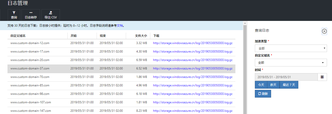 - 日志下载:提供最近 30 天的日志存储和下载。 转到日志管理视图,单击“查询”功能,选择域名和时间,然后单击“刷新”。