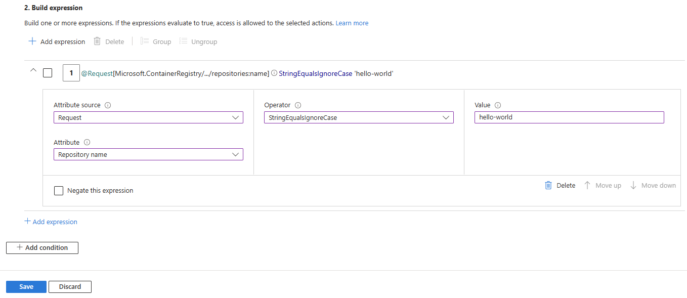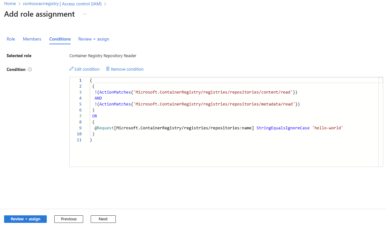 通过添加 ABAC 条件,此角色分配允许标识仅从指定的存储库拉取映像、查看标记和读取元数据,从而阻止访问注册表中的其他存储库。