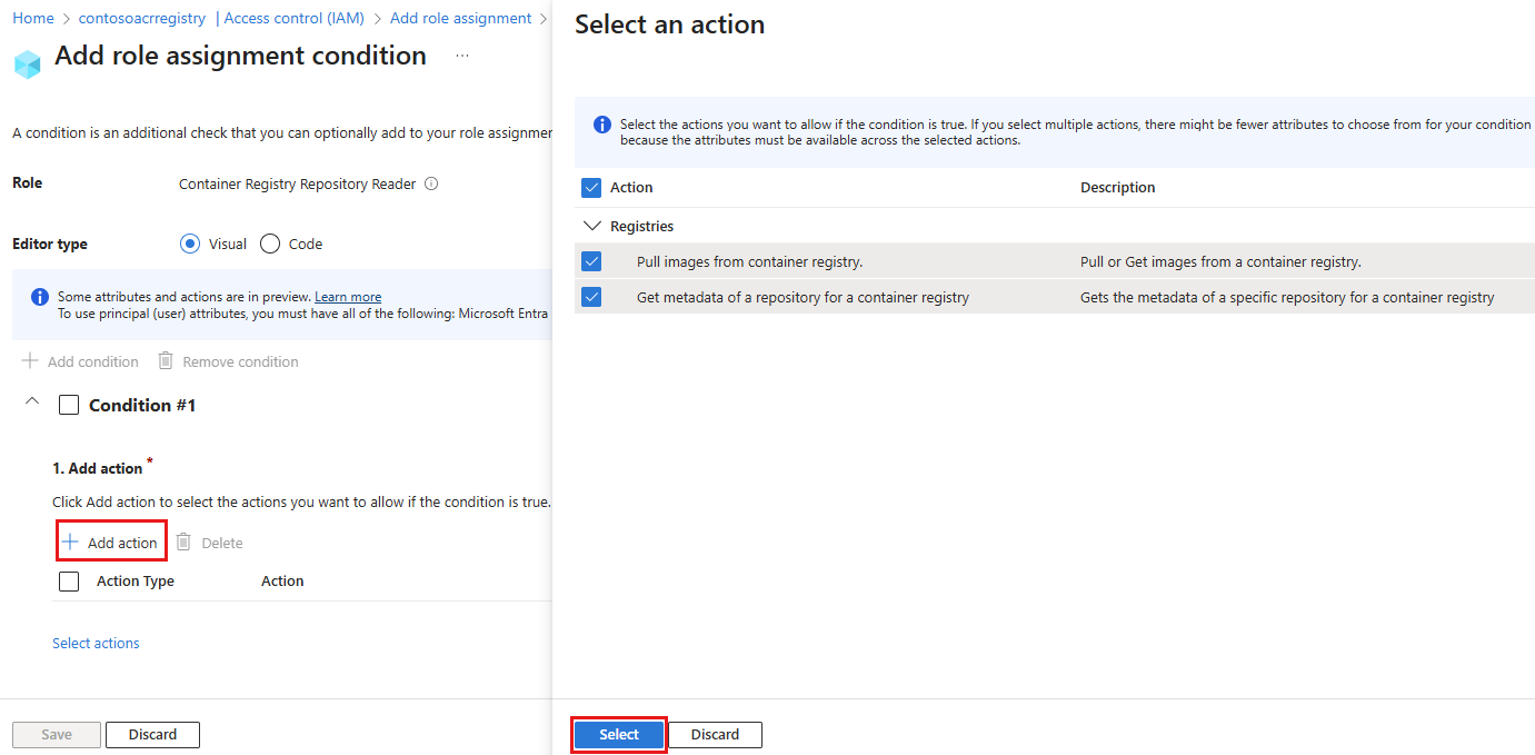 如果在没有 ABAC 条件的情况下分配启用了 ABAC 的角色,则角色分配的范围不限定于存储库。 此角色分配充当注册表范围的角色分配,向注册表中的所有存储库授予权限。 若要将角色分配限定为特定存储库,请在分配已启用 ABAC 的角色时包括 ABAC 条件。