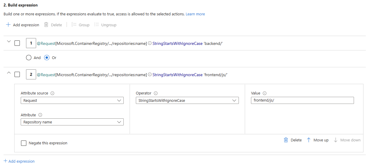 在为 ABAC 条件添加表达式的步骤中,将两个表达式配置为将角色分配范围限定为两个前缀下的多个存储库: