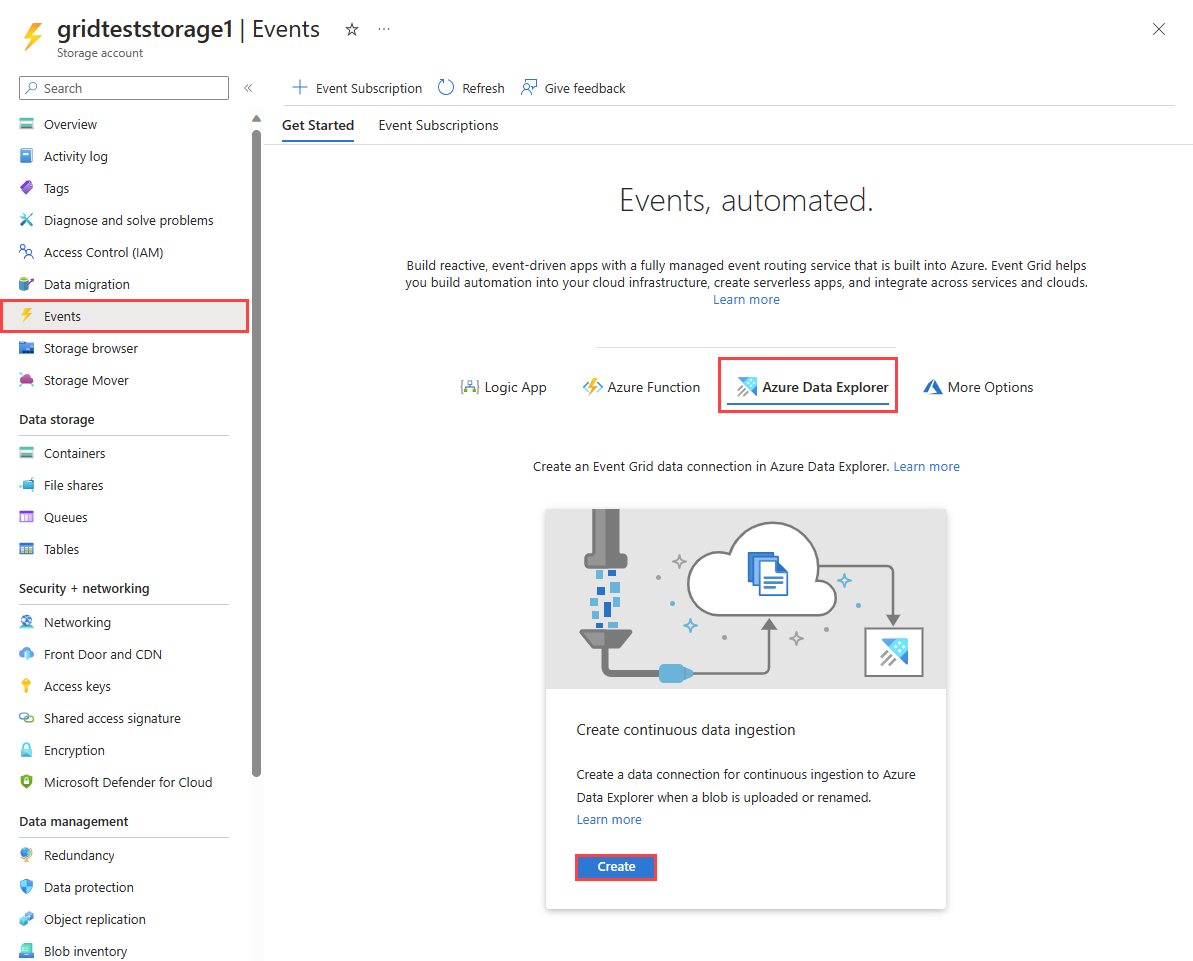 本文介绍如何使用事件网格数据连接将 blob 从存储帐户引入到 Azure 数据资源管理器。 你将创建一个用于设置 Azure 事件网格订阅的事件网格数据连接。 事件网格订阅通过 Azure 事件中心将事件从存储帐户路由到 Azure 数据资源管理器。