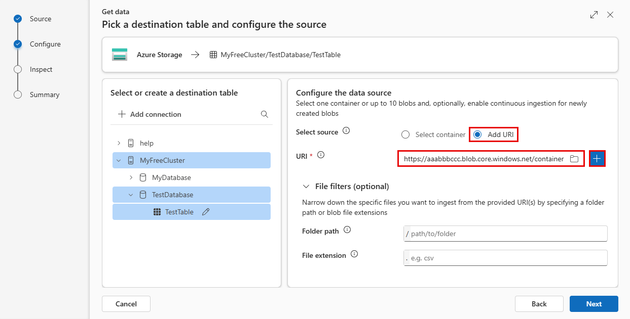 设置 字段说明 订阅 存储帐户所在的订阅 ID。 存储帐户 标识存储帐户的名称。 容器 要引入的存储容器。 文件筛选器(可选) 文件夹路径 筛选数据以引入具有特定文件夹路径的文件。 文件扩展名 筛选数据以仅引入具有特定文件扩展名的文件。 如果选择 添加 URI:
