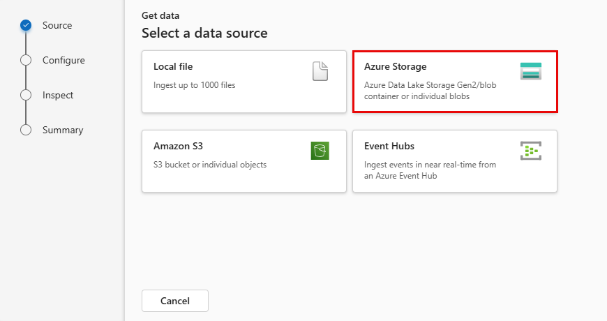 从可用列表中选择数据源。 在此示例中,你将从 Azure 存储引入数据。