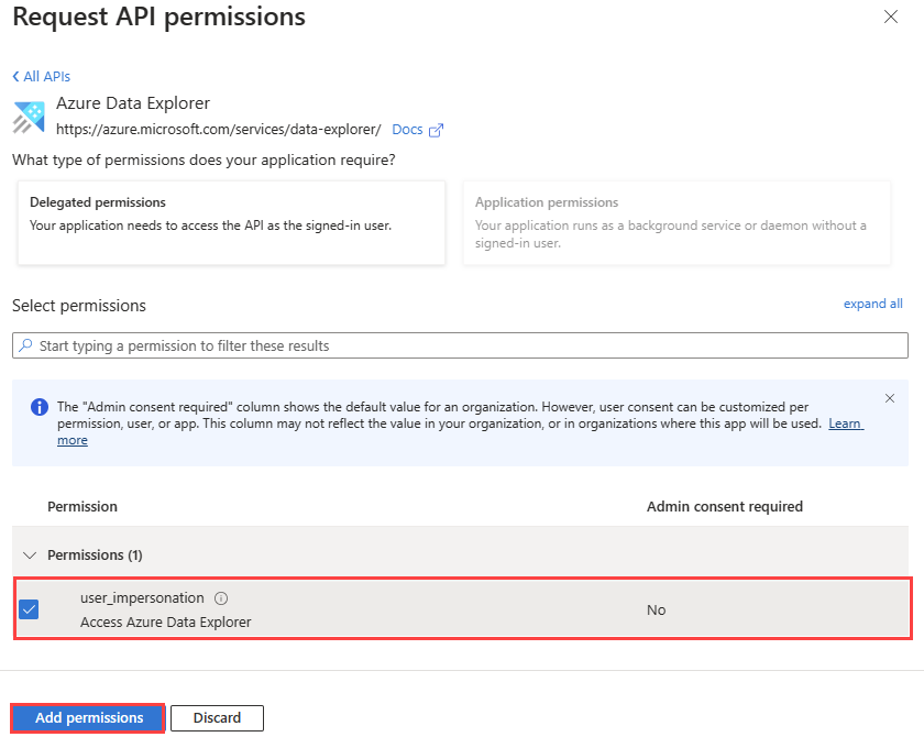 如果你的应用程序需要使用进行调用的用户的凭据访问你的数据库,请为应用程序配置委托的权限。 例如,如果要生成 Web API 并且想使用调用 API 的用户的凭据进行身份验证。