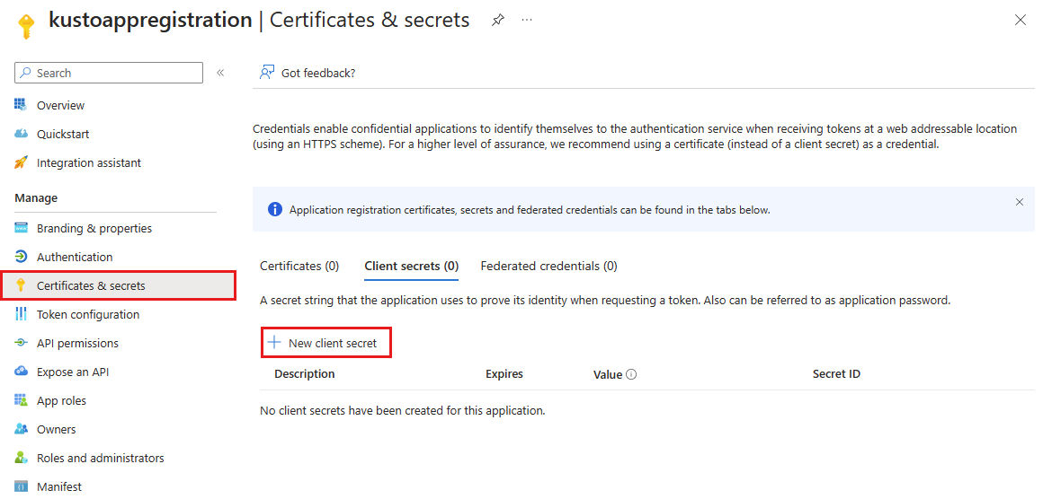在“证书和机密”边栏选项卡中,选择“新建客户端密码”。