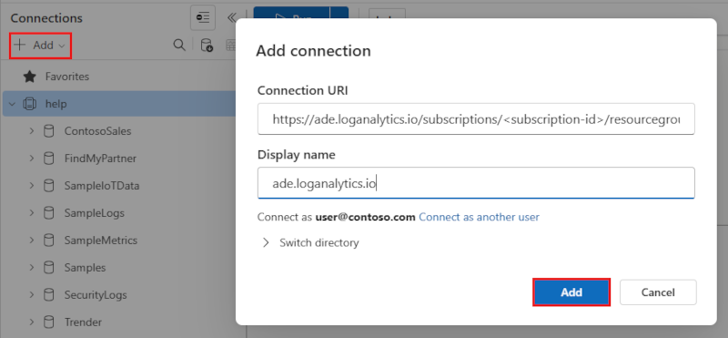 在 Azure 数据资源管理器 UI 中,依次选择“+ 添加”和“连接”。