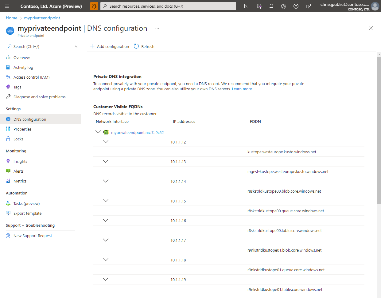 { "value": [ { "id": "/subscriptions/<subscriptionIdADX>/resourceGroups/<resourceGroupNameADX>/providers/Microsoft.Kusto/Clusters/<clusterName>/PrivateLinkResources/cluster", "name": "<clusterName>/cluster", "type": "Microsoft.Kusto/Clusters/PrivateLinkResources", "location": "<the region of your cluster>", "properties": { "groupId": "cluster", "requiredMembers": [ "Engine", "DataManagement", "blob-storageAccount1", "queue-storageAccount1", "table-storageAccount1", "blob-storageAccount2", "queue-storageAccount2", "table-storageAccount2" ], "requiredZoneNames": [ "privatelink.<the region of your cluster>.kusto.chinacloudapi.cn", "privatelink.blob.core.chinacloudapi.cn", "privatelink.queue.core.chinacloudapi.cn", "privatelink.table.core.chinacloudapi.cn" ], "provisioningState": "Succeeded" } } ] }在 Azure 门户中,导航到专用终结点,然后选择“DNS 配置”。 在此页上,可以获取将 IP 地址映射到 DNS 名称所需的信息。