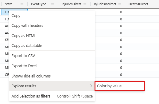StormEvents | take 10选择包含你要为其创建查询筛选器的内容的单元格。 若要选择多个单元格,请单击鼠标并拖动到你要选择的单元格上,或者在按住“Ctrl”键的同时单击每个单元格。 例如,从