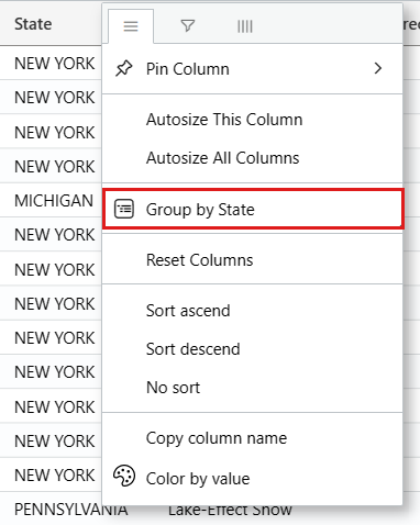 StormEvents | where EventType == "Lake-Effect Snow"将鼠标悬停在“州”列上,选择菜单,然后选择“按州分组” 。