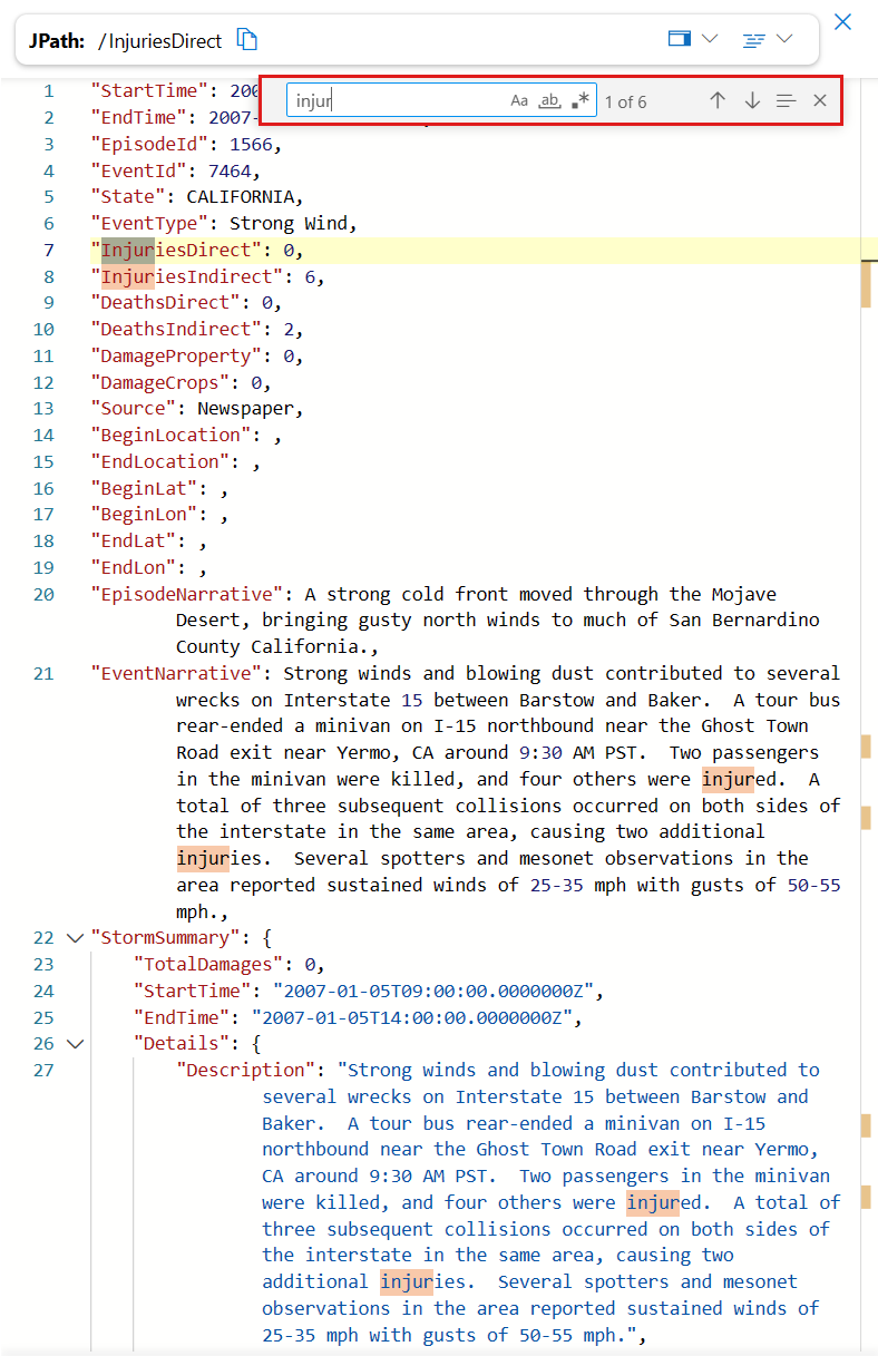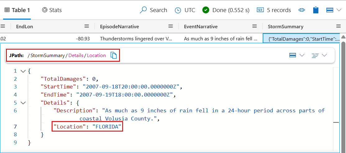 StormSummary列(它应该是最后一列)中的第一个结果。在结果中选择不同的字段,并查看窗口顶部的 JPATH 如何变化。 例如,以下屏幕截图显示了