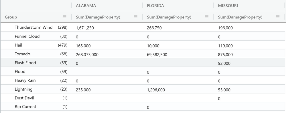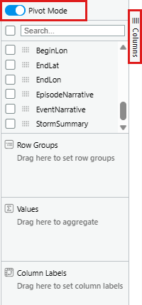 将列拖到“行组”、“值”、“列标签”部分。 例如,如果将“EventType”拖到“行组”,将“DamageProperty”拖到“值”,将“State”拖到“列标签”,则结果应类似于以下透视表。
