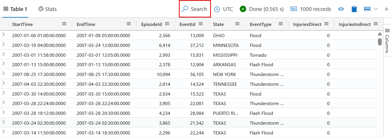 StormEvents | where DamageProperty > 5000 | take 1000在结果网格顶部菜单中的右侧,选择“搜索”并键入“Wabash”。