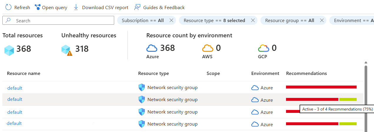 Microsoft Defender for Cloud 不断分析 Azure 资源的安全状态,以实现网络安全最佳做法。 在 Defender for Cloud 识别出潜在的安全漏洞时,它会创建一些建议,指导完成配置所需控件以强化和保护资源的过程。