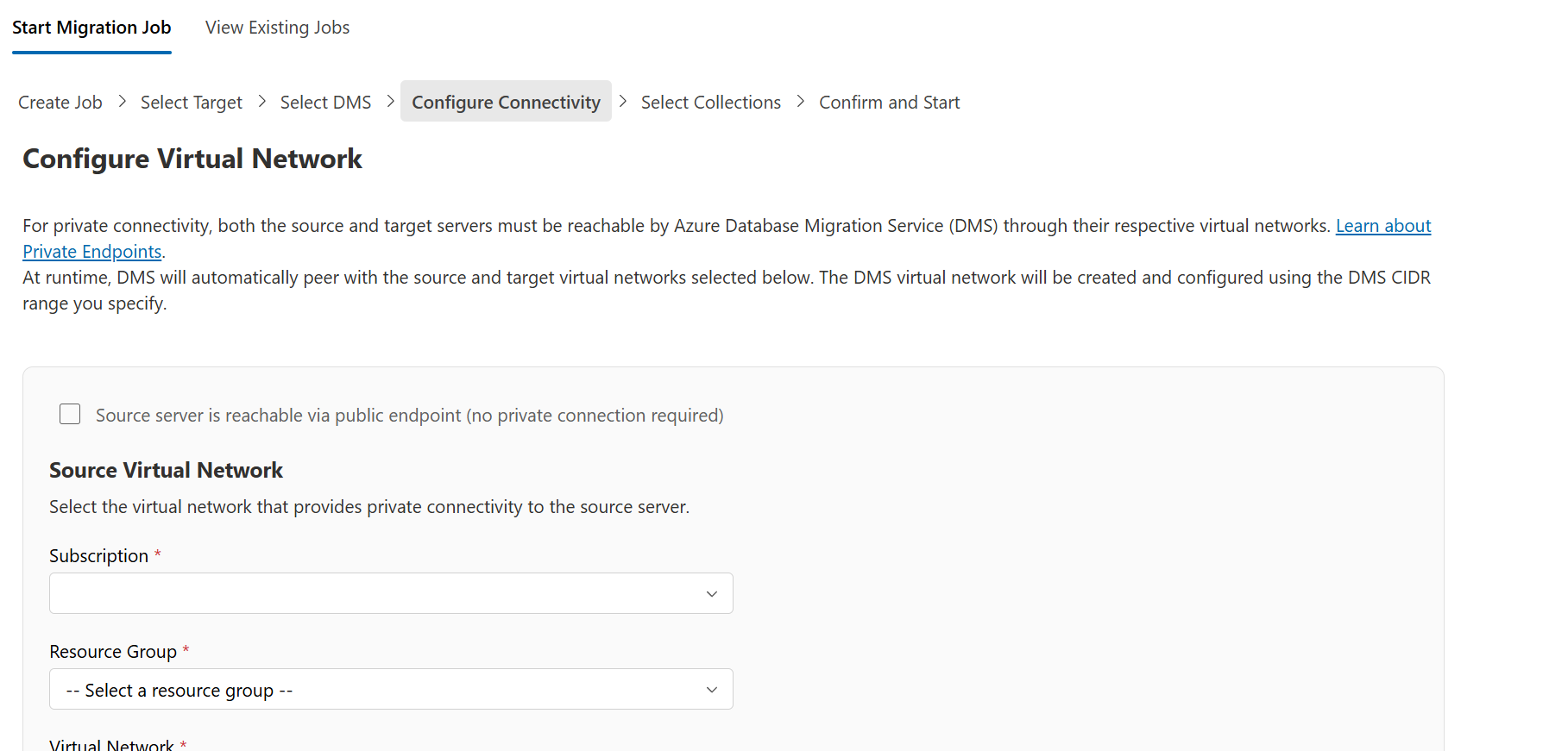 - Private mode: 必须启用 virtual network 集成,以便 DMS 服务器能够安全地与virtual network中的源终结点和目标终结点通信。