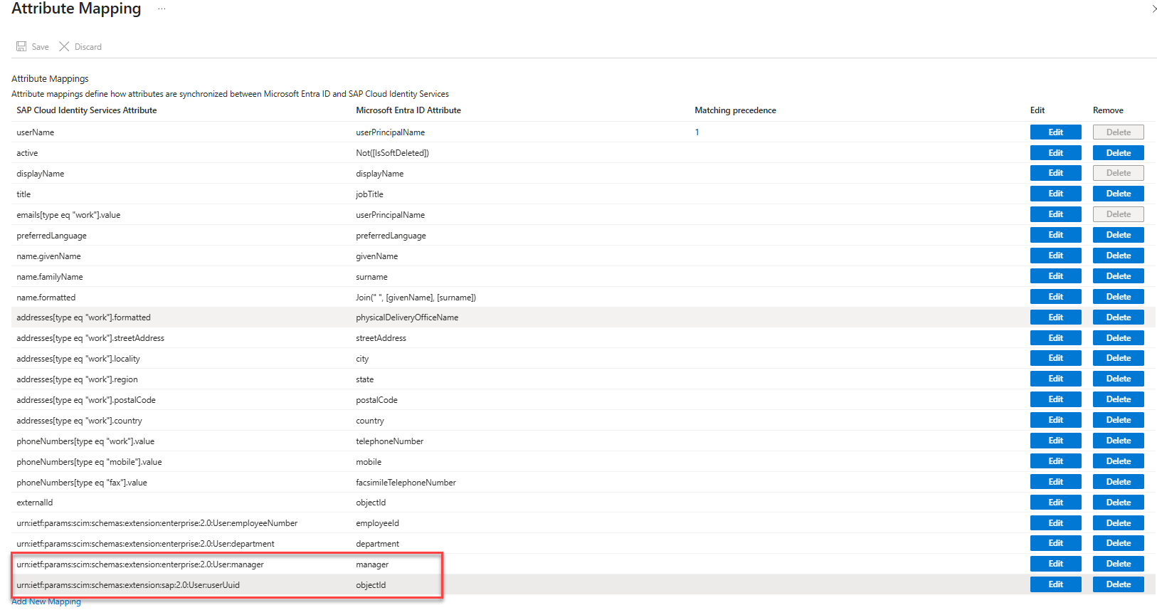 添加管理器属性的映射。 这样,管理器信息就可以从 Microsoft Entra 同步到 SAP Cloud Identity Services。