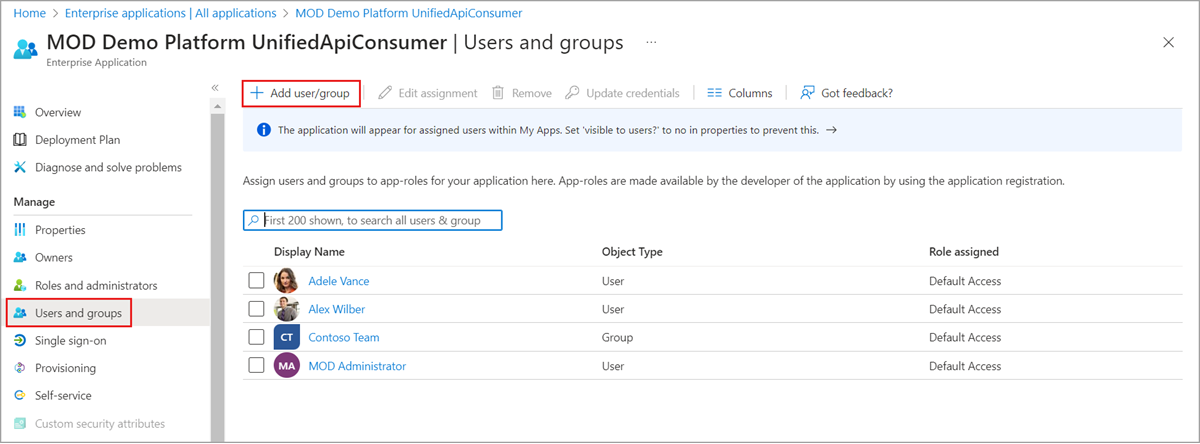 • 若要向被分派人授予权限以管理特定企业应用的用户和组访问权限,请在 Microsoft Entra ID 中转到该应用,并打开该应用的“角色和管理员”列表。 选择新的自定义角色并完成用户或组分配。 被分派人只能管理特定应用的用户和组访问权限。