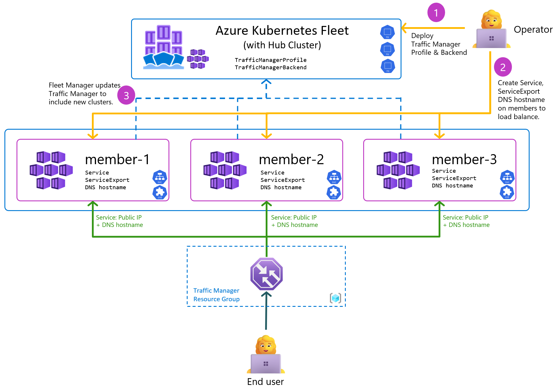 Azure Kubernetes Fleet Manager 可用于为跨成员群集部署的面向公众的工作负荷创建和管理基于 DNS 的多群集负载均衡。
