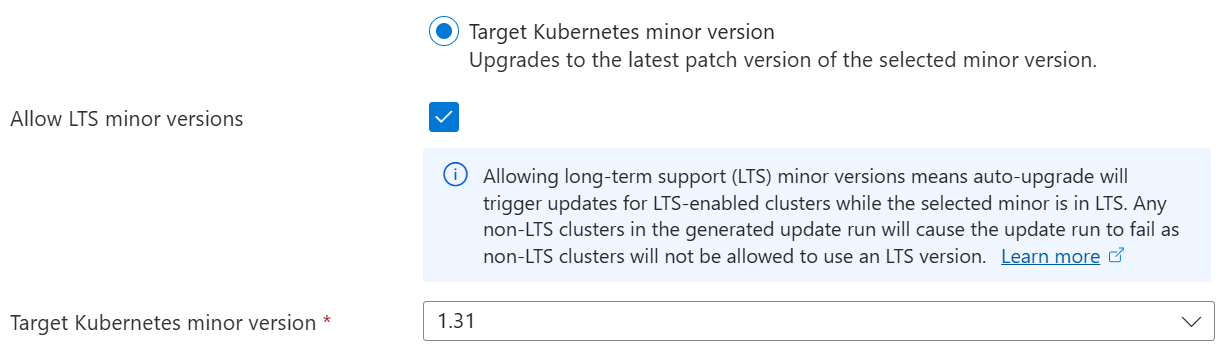 • 允许 LTS 次要版本:允许选择仅适用于 AKS 长期支持 (LTS) 群集的 Kubernetes 次要版本。