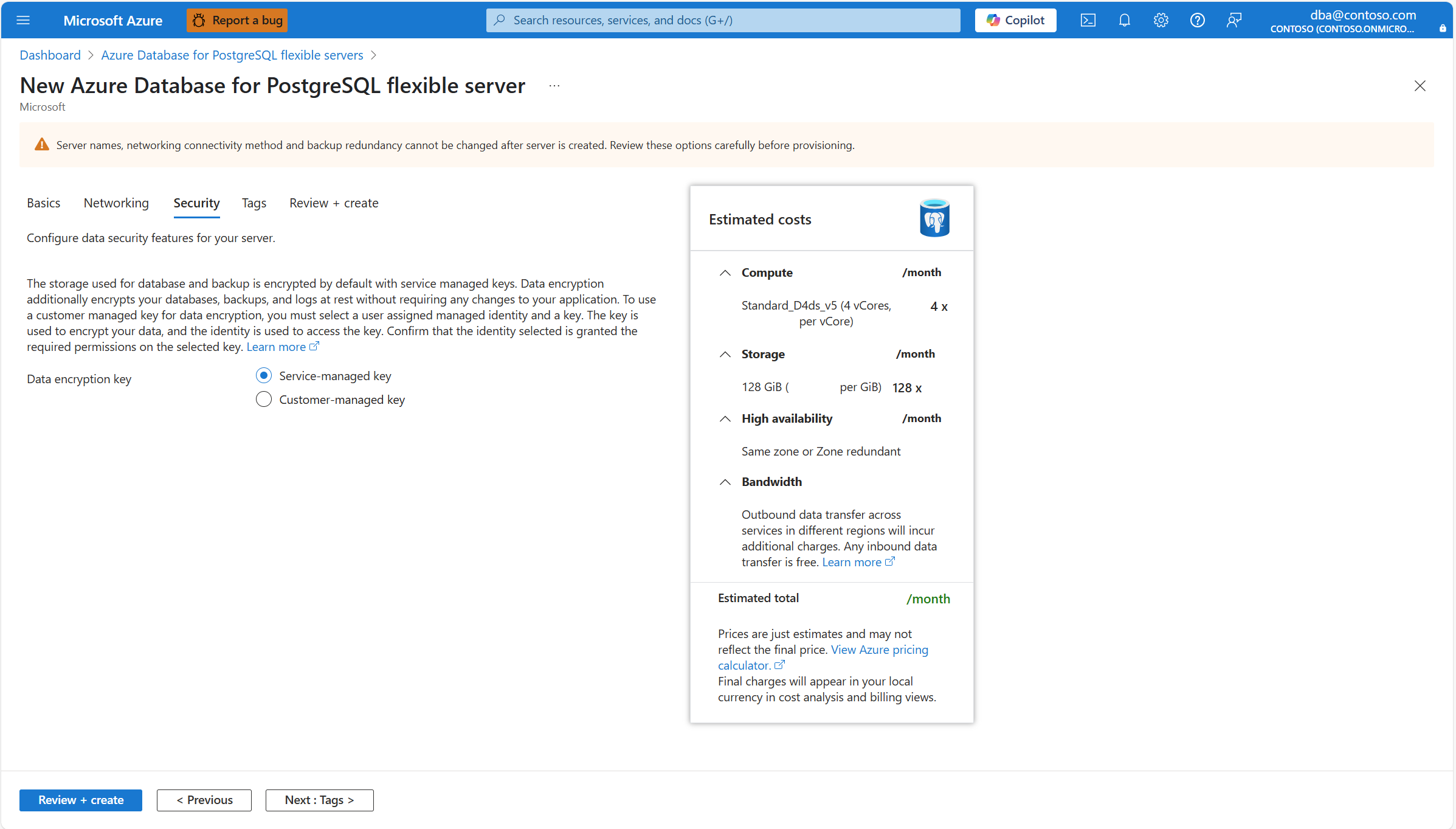 数据加密密钥 保留默认设置。 可能的值是“服务托管密钥”和“客户管理的密钥”。 有关详细信息,请参阅 Azure Database for PostgreSQL 中的数据静态加密 创建实例后无法更改。