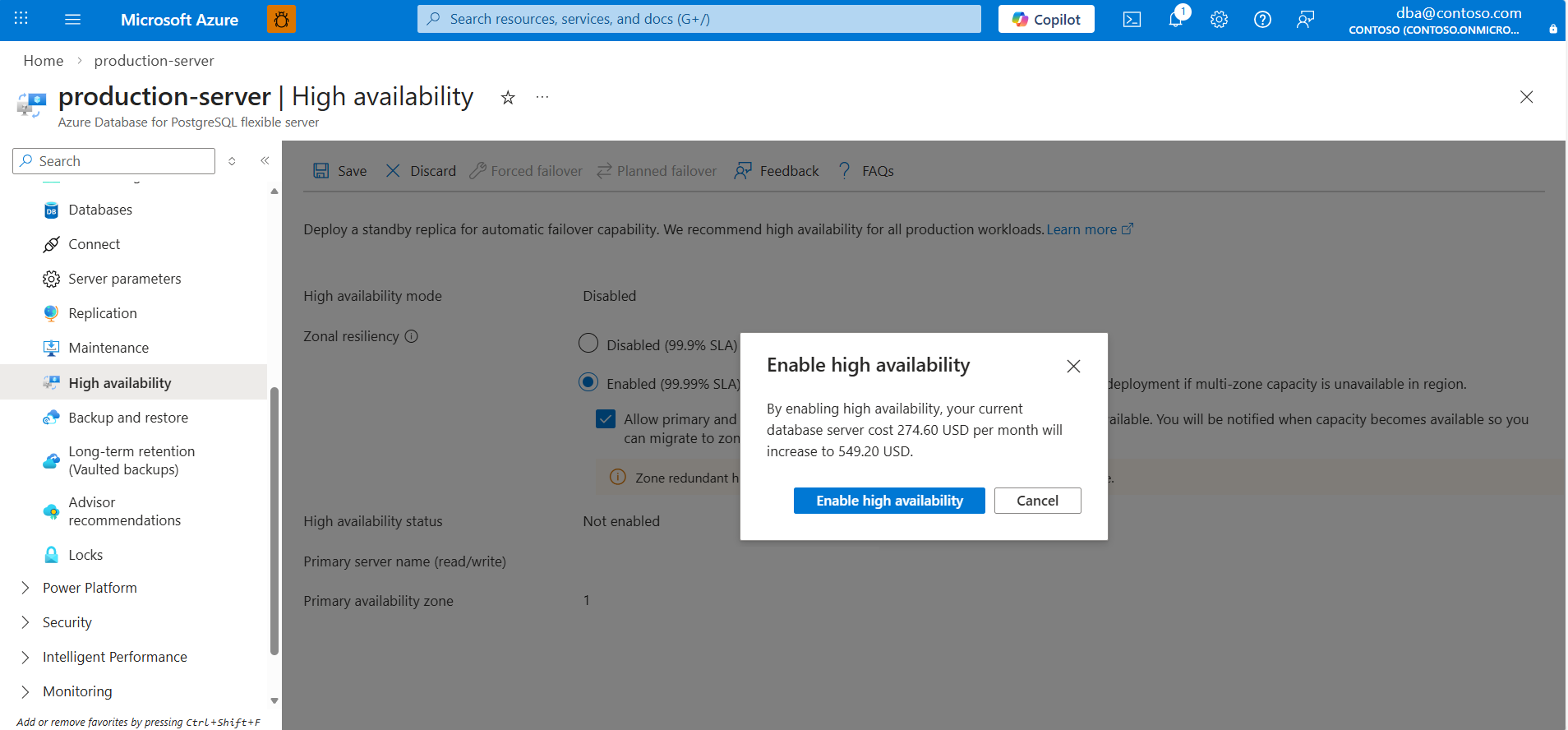 5. 对话框显示与部署备用服务器关联的成本增加。 如果决定继续,请选择“启用高可用性”
