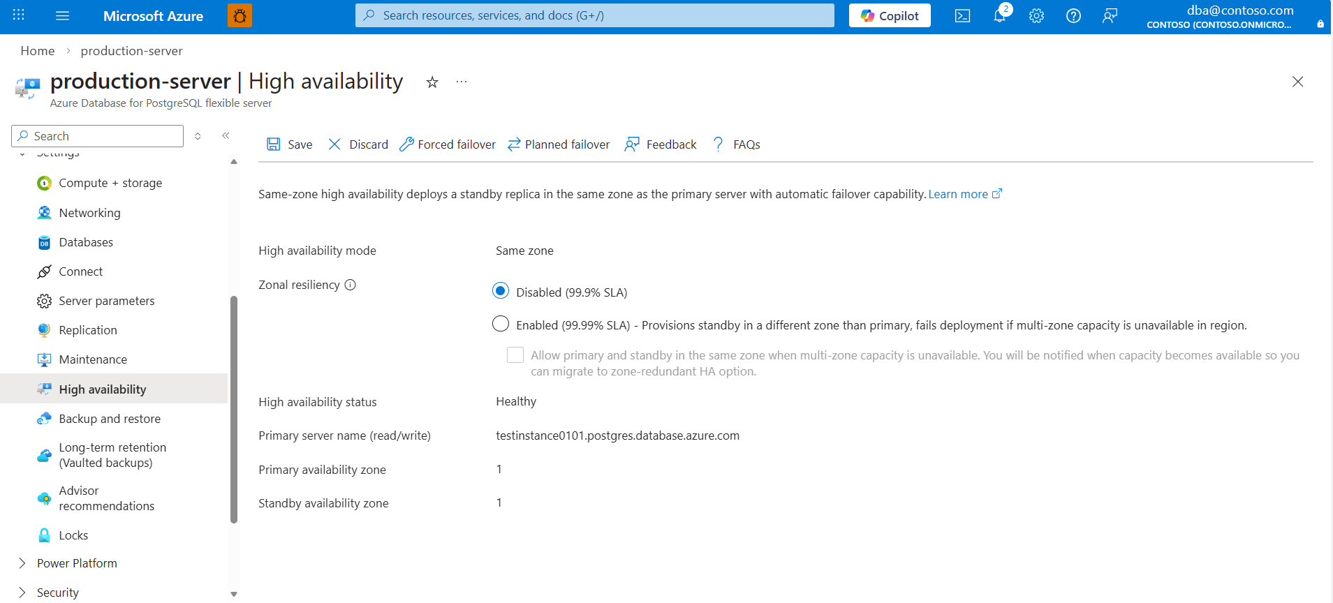 1. Azure 门户中,选择已启用高可用性的 Azure Database for PostgreSQL 灵活服务器实例。