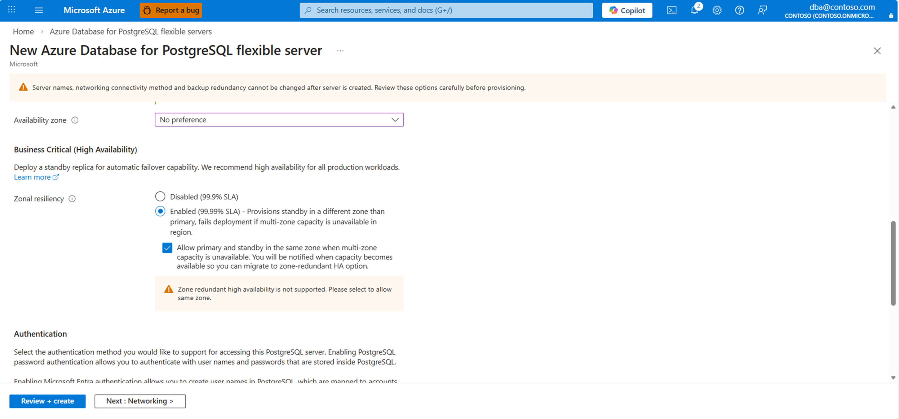 • 如果区域容量不可用,请选择“如果区域复原能力失效,允许在同一区域使用备用”复选框作为回退。 如果未选择此选项,则无法继续执行创建工作流中的下一步。 此检查可确保保持高可用性。 当区域容量可用时,Azure 会通知你。 然后,可以使用 PITR 或读取副本将工作负荷迁移到区域冗余 HA 配置,以实现最大复原能力。