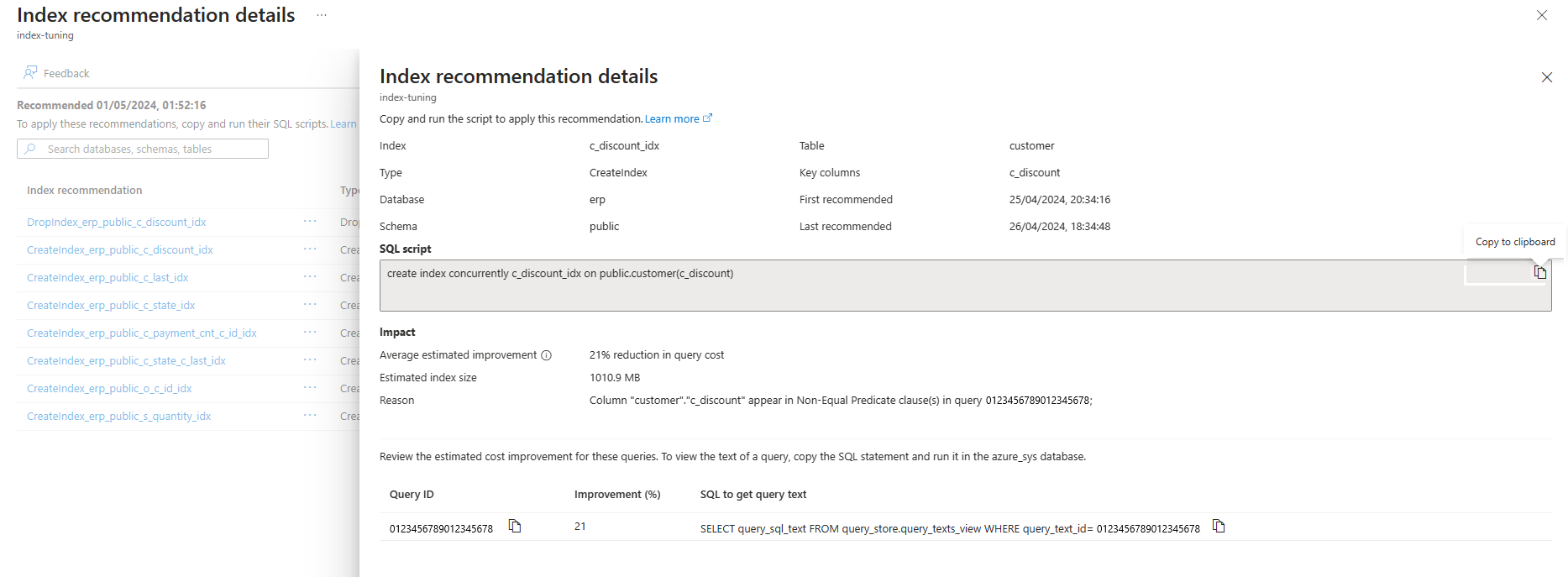 可以使用 Azure 门户中的 “索引优化 ”页或使用 Azure CLI az postgres flexible-server index-tuning list-recommendations 命令读取这些建议。