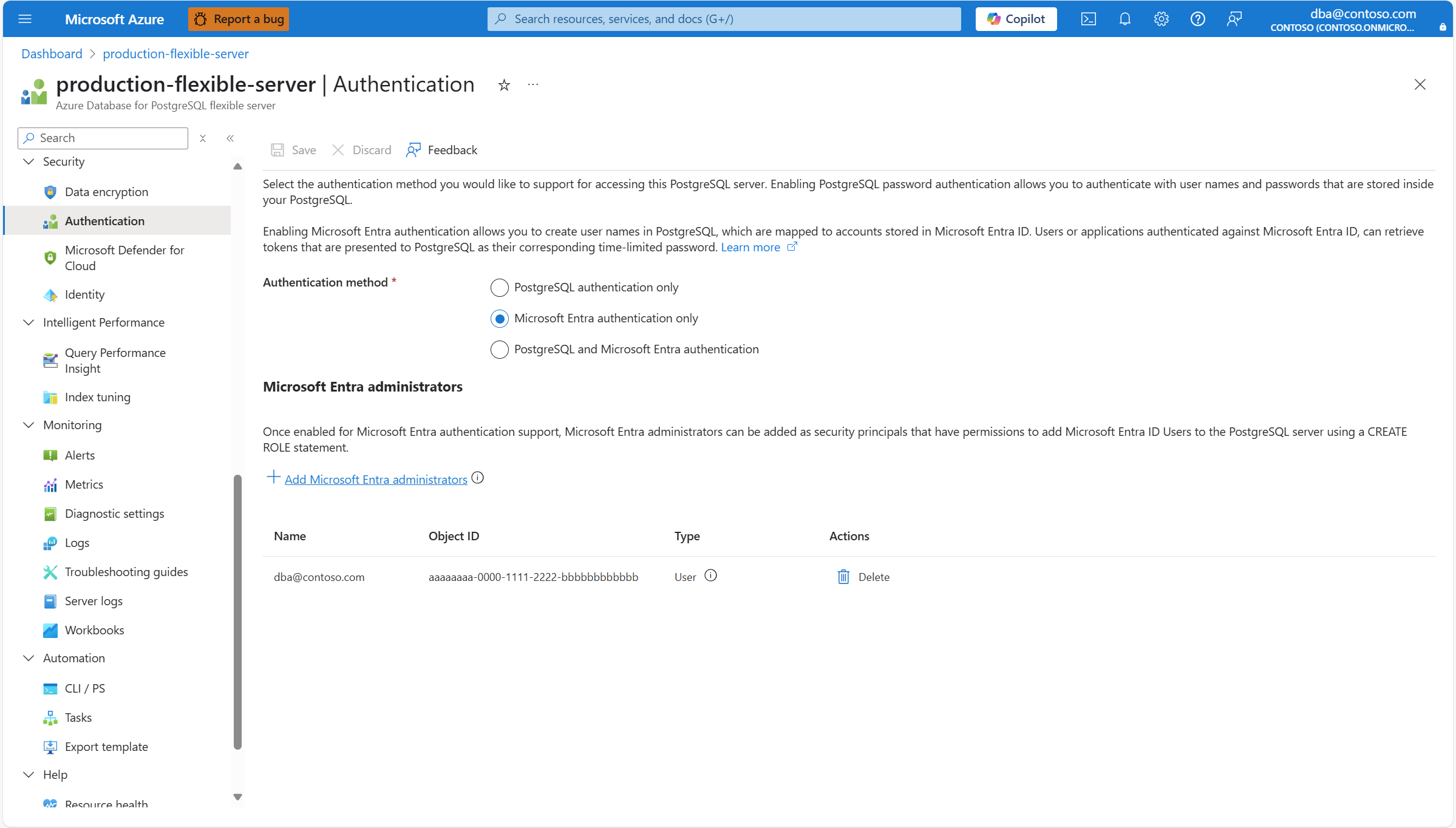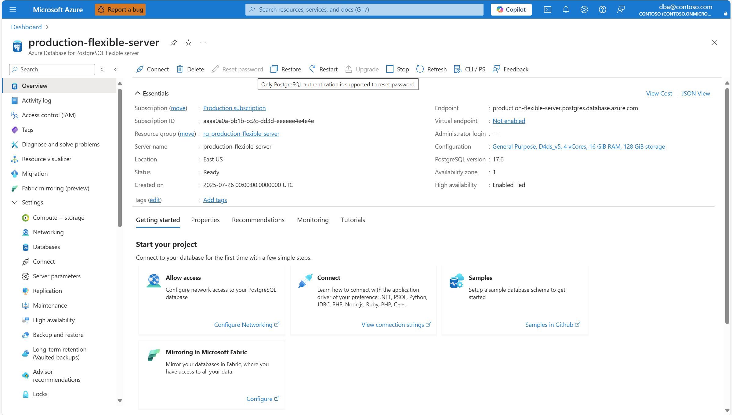 身份验证方法必须为“仅 PostgreSQL 身份验证”或“PostgreSQL 和 Microsoft Entra 身份验证”,才会在工具栏上启用“重置密码”按钮。 当设置为“仅 Microsoft Entra 身份验证”时,将禁用“重置密码”按钮。