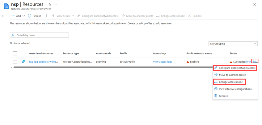 | 转换 | 这是默认访问模式。 此模式下的评估使用网络安全外围配置作为基线。 如果找不到匹配规则,评估会回退到资源防火墙配置,然后可以使用现有设置批准访问权限。 |