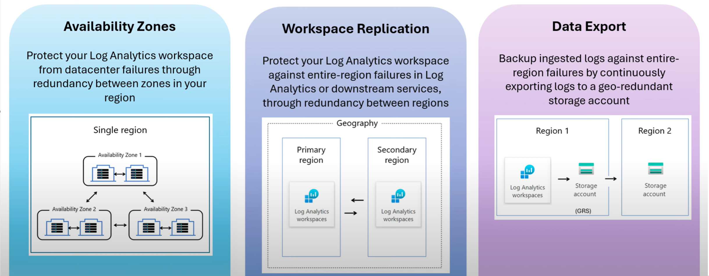 Azure Monitor 日志并不提供传统意义上的时间点备份或恢复功能。 相反,持久性和恢复依赖于区域内部复制(包括区域冗余)、可选的工作区复制和数据导出来维护外部副本。 若要在发生故障后快速分析恢复,请依赖于平台复制而不是还原操作。
