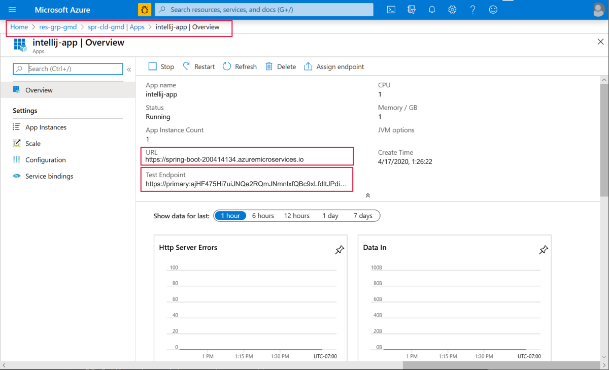 mvn package,然后创建新的应用并部署由package命令生成的 jar。如果应用 URL 未显示在输出窗口中,请从 Azure 门户获取它。 从资源组导航到 Azure Spring Apps 实例。 然后选择“应用”。 将会列出正在运行的应用。 选择应用,然后复制“URL”或“测试终结点” 。