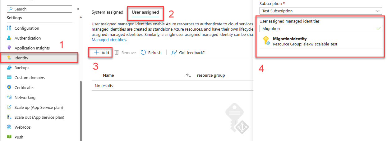 你需要将 Web 应用配置为使用自己创建的托管标识。 使用 Azure 门户或 Azure CLI 将标识分配给应用。