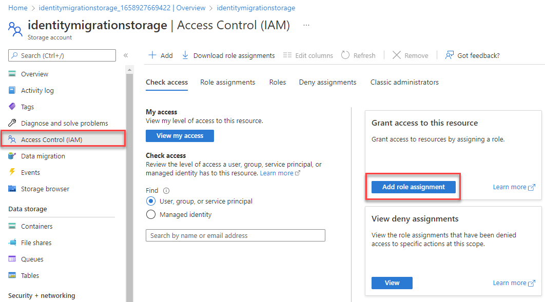 接下来,需要向创建的托管标识授予访问存储帐户的权限。 通过为托管标识分配角色来授予权限,就像对本地开发用户的操作一样。