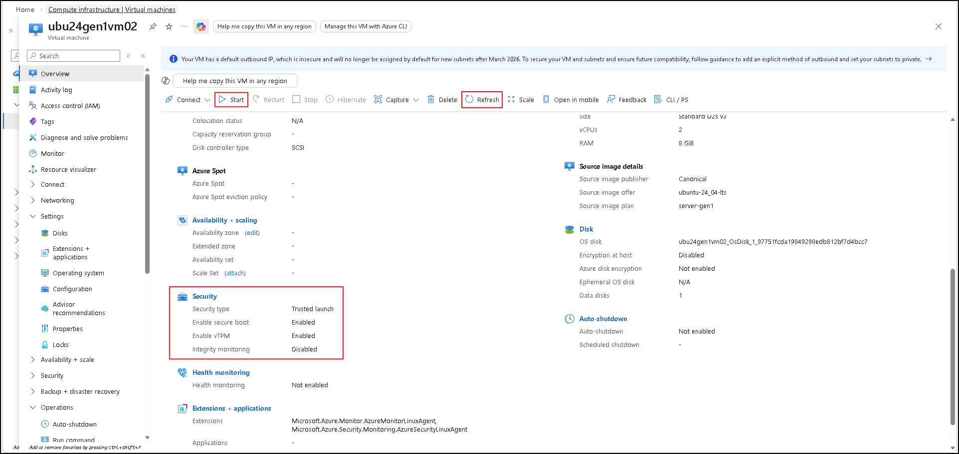 - 默认情况下未启用安全启动。 强烈建议在不使用自定义未签名内核或驱动程序的情况下启用安全启动。 安全启动可保留启动完整性,并为 VM 实现基础安全性。