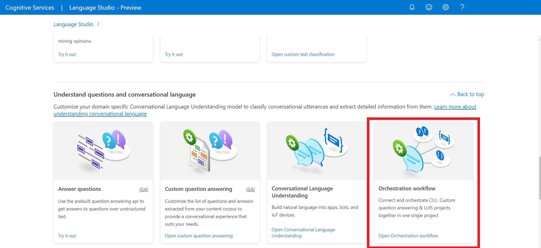 在 Language Studio 中,找到标记为“了解问题和会话语言”的部分,然后选择“业务流程工作流”。