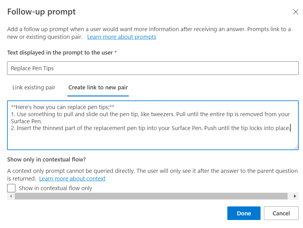 新增包含两个跟进提示“检查兼容性”和“检查触控笔设置”的问答对 使用编辑器,单击“添加问答对”来新增包含一个跟进提示的问答对