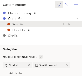 实体调色板的下半部分允许你向当前选定的实体添加特征。 你可以从所有现有实体和短语列表中进行选择,也可以创建新的短语列表。