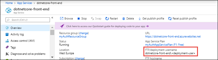 设置用户范围凭据后,可以在 Azure 门户的应用 “概述 ”页上看到部署用户名。 如果配置了本地 Git 部署,则标签为 Git/部署用户名。 否则,标签为 FTP/部署用户名。