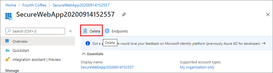 如果你完成了本教程(包含多个部分)中的所有步骤,那么就已在资源组中创建了应用服务、应用服务托管计划和存储帐户。 你还在 Microsoft Entra ID 中创建了应用注册。 如果不再需要这些资源和应用注册,请将其删除,以免继续产生费用。