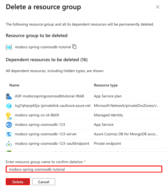 - 在“资源组”中,选择“msdocs-spring-cosmosdb-tutorial”。