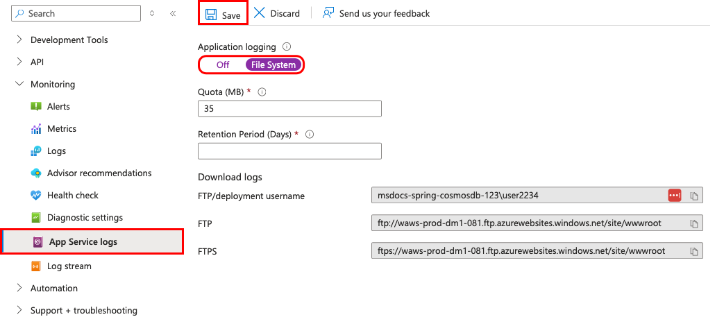 - 在“应用程序日志记录”下,选择“文件系统”。
