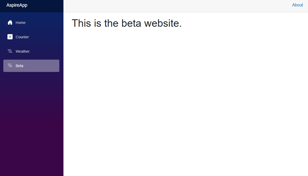 // Existing code // ... ... <div class="nav-scrollable" onclick="document.querySelector('.navbar-toggler').click()"> <nav class="nav flex-column"> // Existing code // ... ... @if (isBetaEnabled) { <div class="nav-item px-3"> <NavLink class="nav-link" href="beta"> <span class="bi bi-list-nested" aria-hidden="true"></span> Beta </NavLink> </div> } </nav> </div> @code { private bool isBetaEnabled; protected override async Task OnInitializedAsync() { isBetaEnabled = await FeatureManager.IsEnabledAsync("Beta"); } }