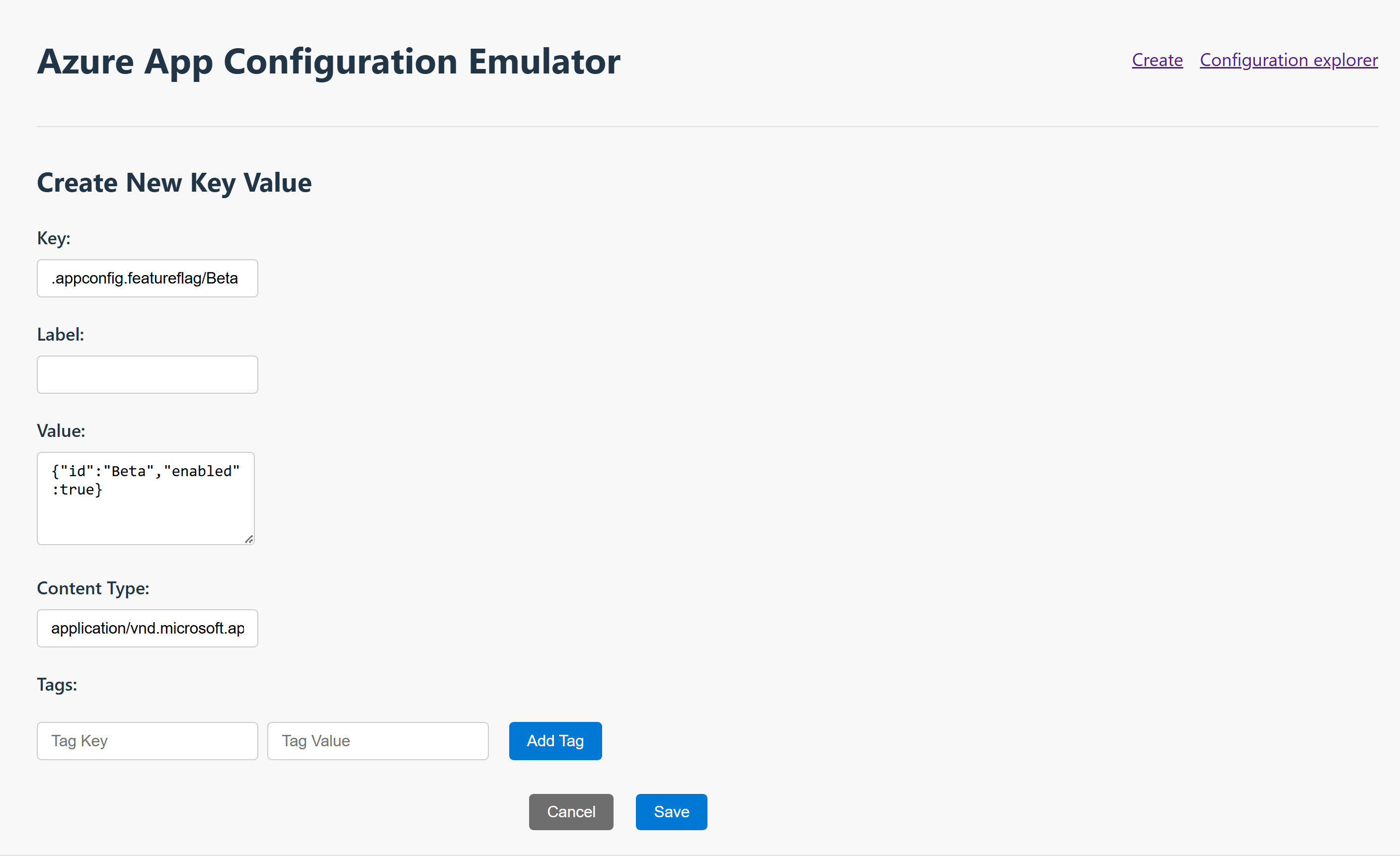 | .appconfig.featureflag/Beta | application/vnd.microsoft.appconfig.ff+json;charset=utf-8 | {“id”:“Beta”,“enabled”:false} |