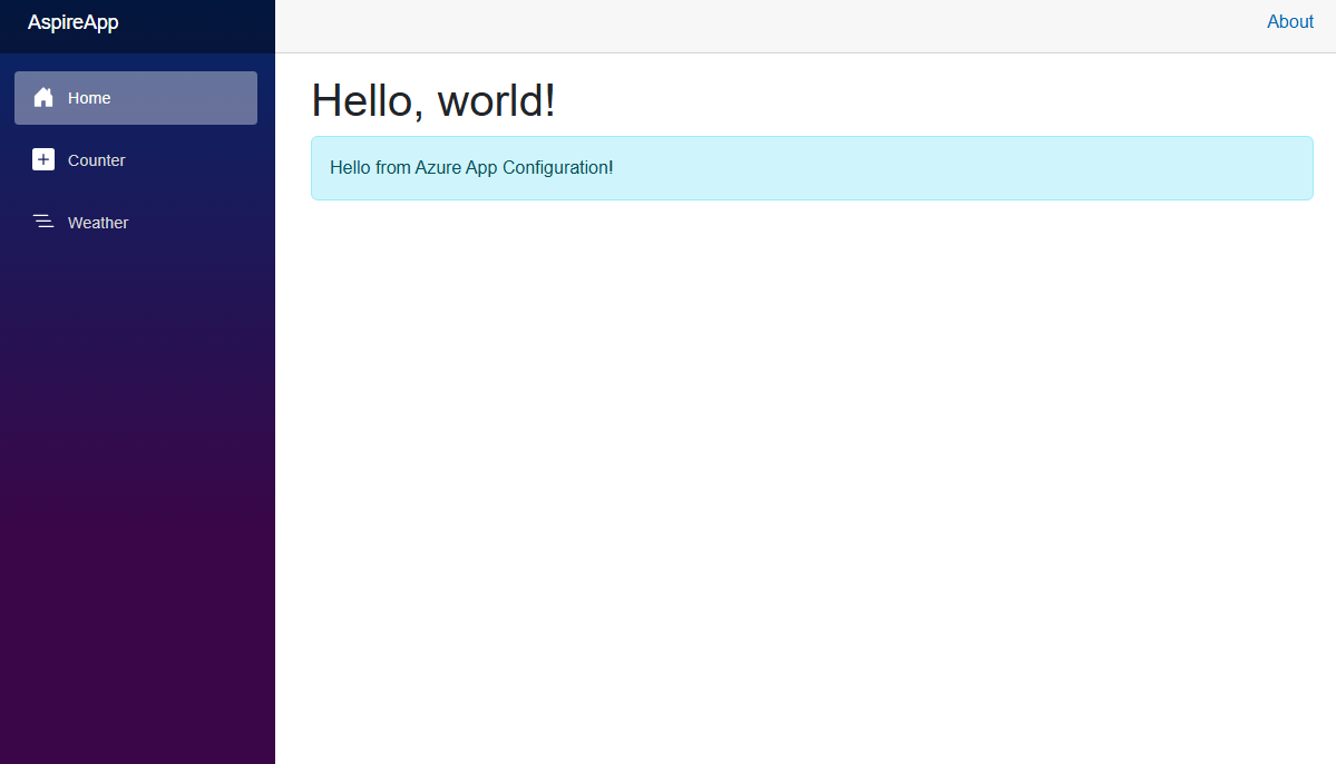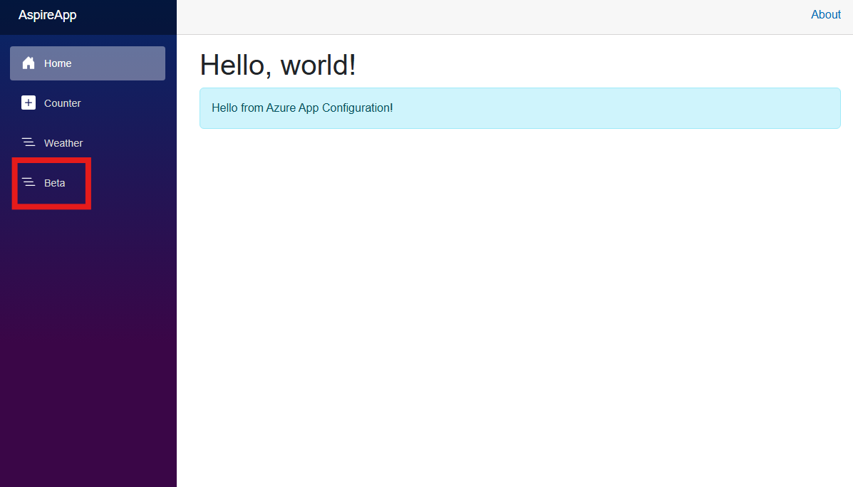 IVariantFeatureManager。@inject IVariantFeatureManager FeatureManager <div class="top-row ps-3 navbar navbar-dark"> <div class="container-fluid"> <a class="navbar-brand" href="">AspireApp</a> </div> </div>添加以下代码。