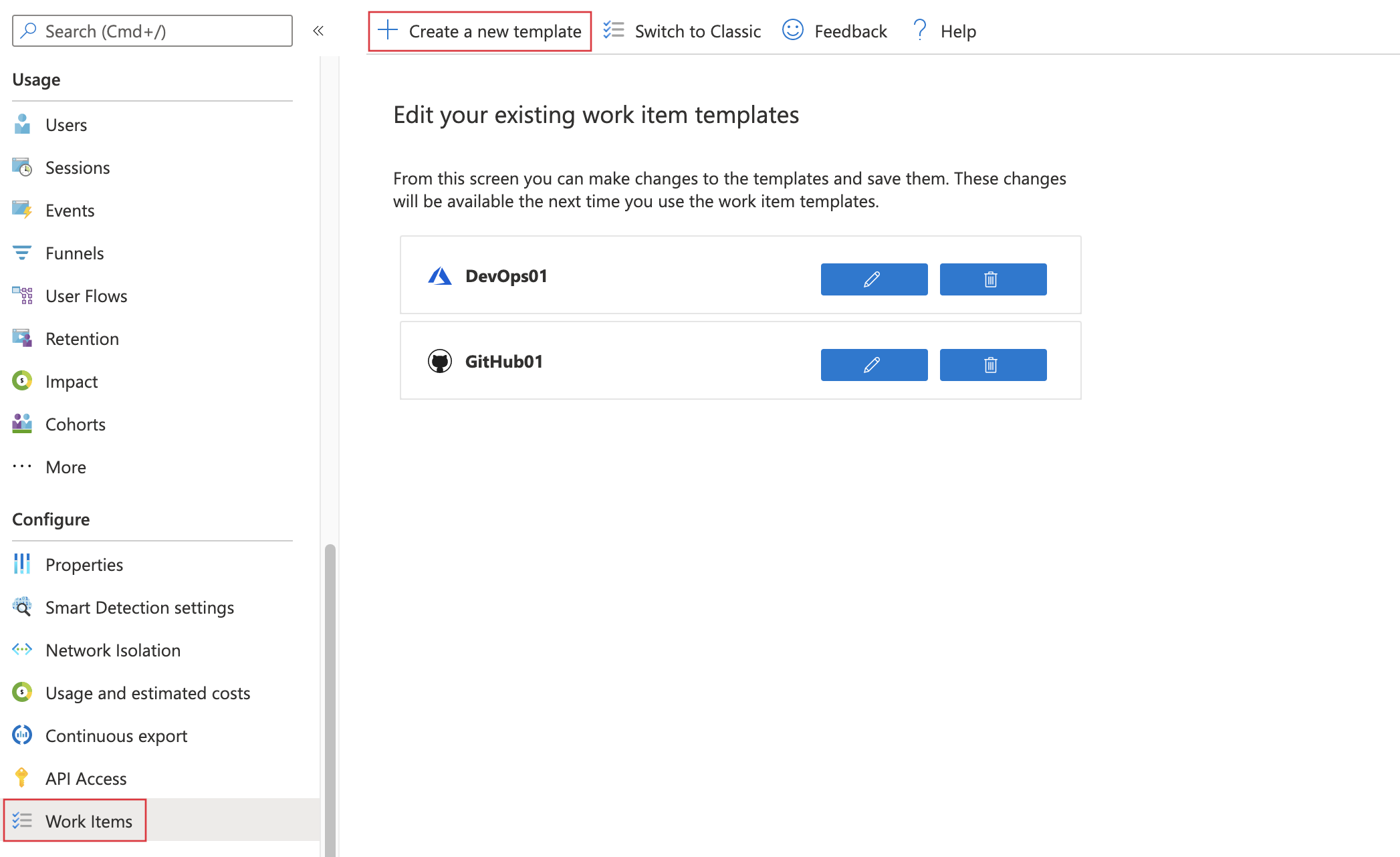 若要删除,请在你的 Application Insights 资源中点击“配置”,选择“工作项”,然后选择“切换到经典版”,最后在顶部选择“删除”。