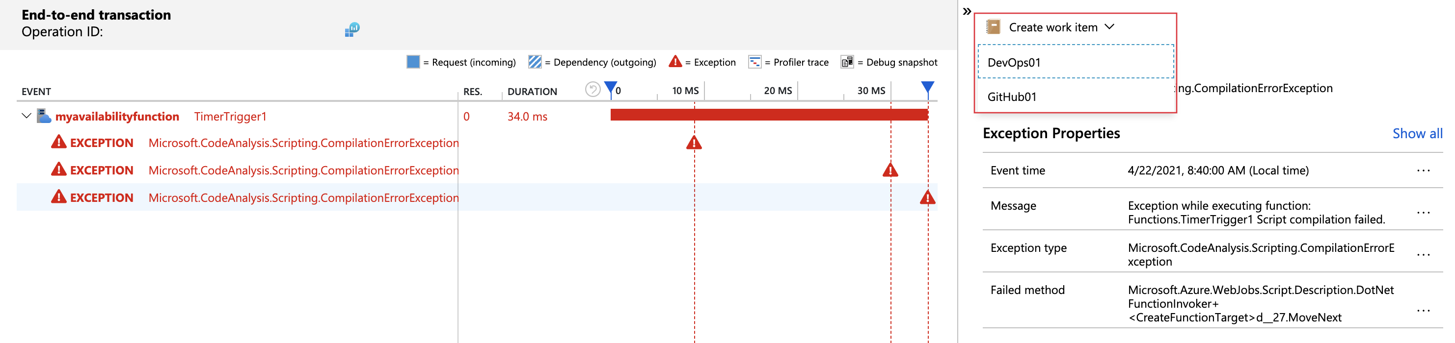 若要创建工作项,请转到“端到端事务详细信息”,选择一个事件,然后选择“创建工作项”并选择你的工作项模板。