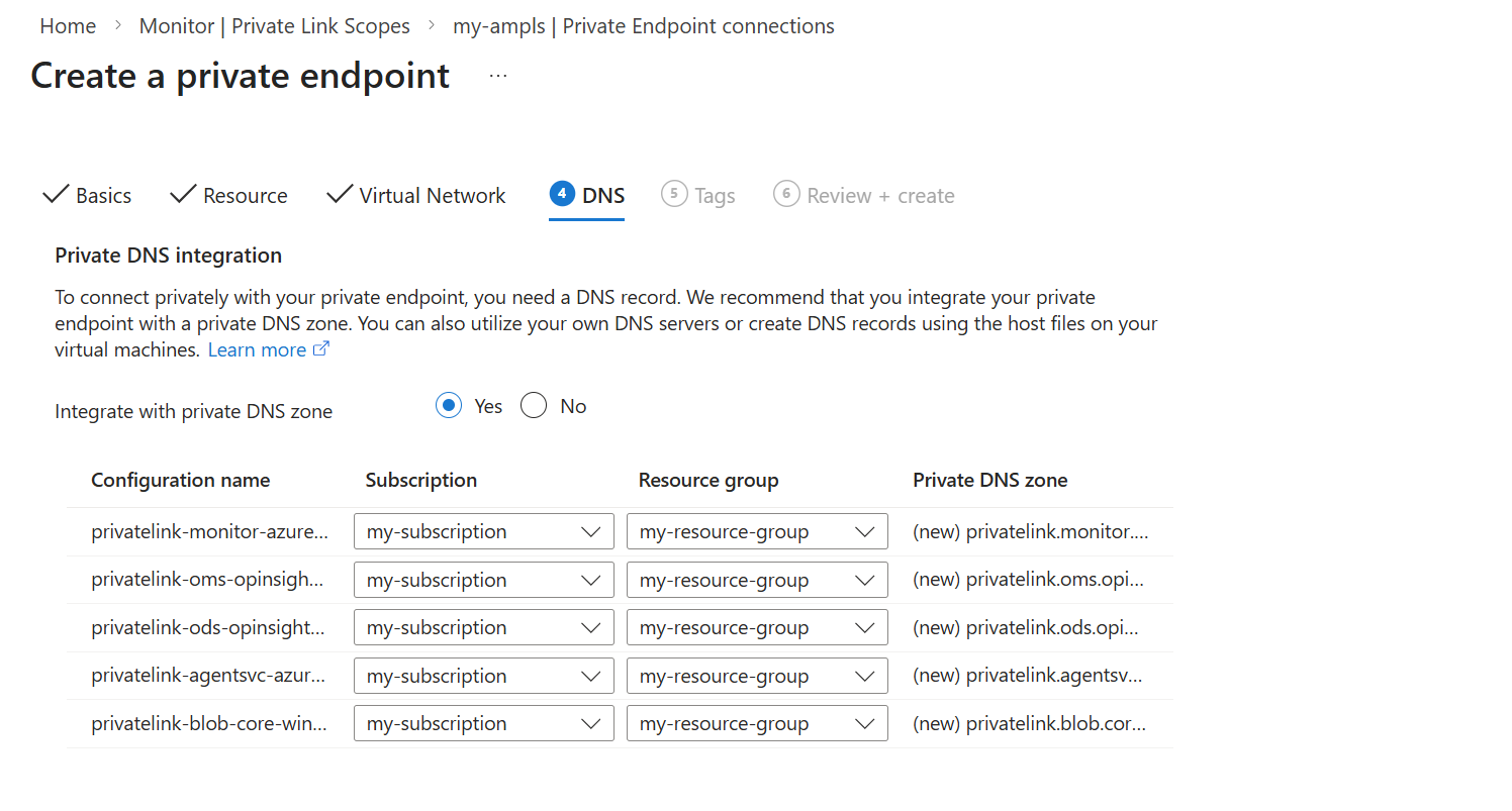 DNS 选项卡允许你选择是否自动为专用终结点创建专用 DNS 区域。 此专用 DNS 区域将具有必要的 DNS 记录,用于通过专用链接将流量从 VNet 路由到Azure Monitor。