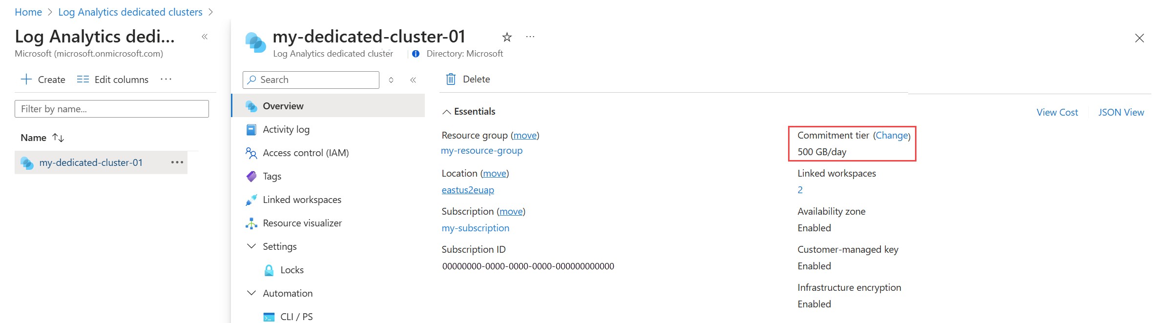在 Azure 门户的“Log Analytics 专用群集”菜单中选择群集,然后单击“承诺层级”旁边的“更改”