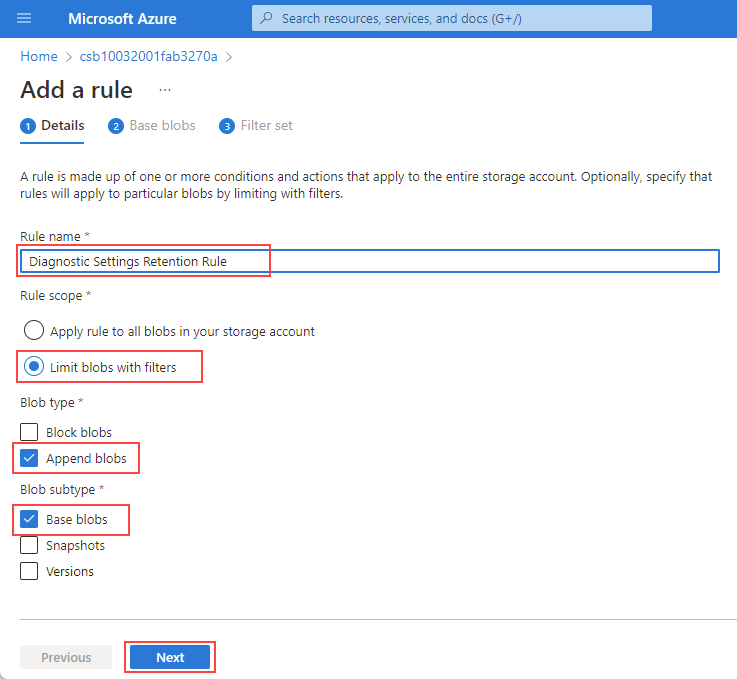 可使用存储浏览器帮助查找路径或前缀。 下面的示例显示了特定 Web 应用的前缀:*insights-activity-logs/ResourceId=/SUBSCRIPTIONS/aaaa0a0a-bb1b-cc2c-dd3d-eeeeee4e4e4e/RESOURCEGROUPS/rg-001/PROVIDERS/MICROSOFT.WEB/SITES/appfromdocker1。 若要为资源组中的所有资源设置规则,请使用 insights-activity-logs/ResourceId=/SUBSCRIPTIONS/aaaa0a0a-bb1b-cc2c-dd3d-eeeeee4e4e4e7/RESOURCEGROUPS/rg-001。